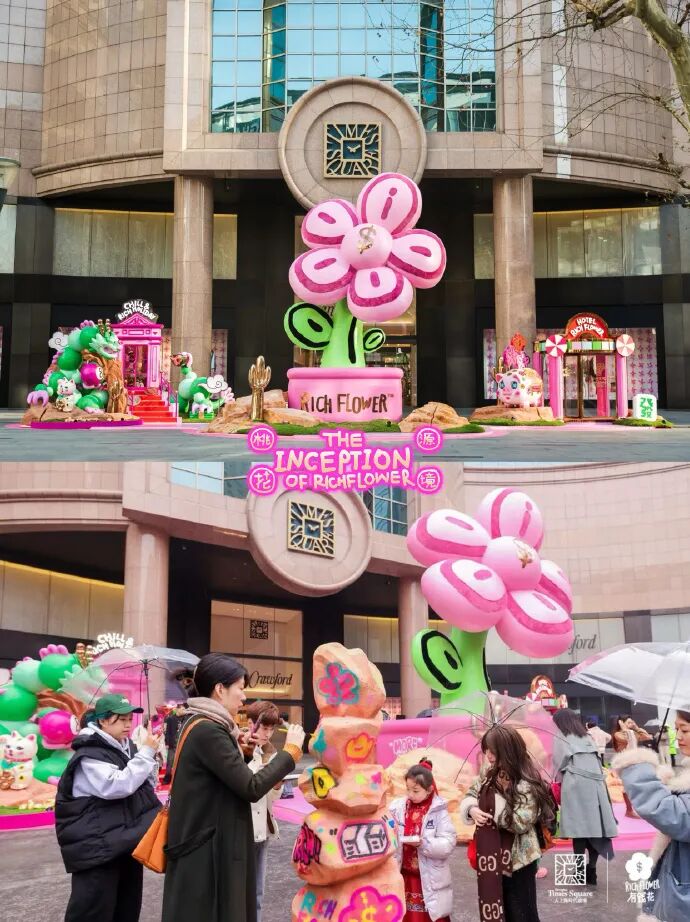 近年来内容营销的关键词,总是离不开人间烟火气和日常生活感,天猫围绕着衣食住行中的“行”做文章,便是想拉近品牌与目标受众之间的心理距离。有时候啊,把生活中并不显眼的东西打造成广告牌,或者把广告牌搬至具有生活气息的地方,往往能够取得亮眼的沟通效果,也成为营销界的一种主流思路。(天猫焕新机场行李传送带就属于前者)小广同样注意到,近日大上海时代广场携手涂鸦及波普艺术家李昱昱,用潮流艺术IP有钱花RICH FLOWER,以「桃花源·境」装置艺术展迎接龙年新春。该线下装置足有7米高,让每一位抬头观看的行人都忍不住发出“WOW”的惊叹。巨大的有钱花与路上行人制造出超现实的“反差萌”与“艺术感”,瞬间赢得无数潮人的心。“有钱花”是一句对美好生活的向往和轻松日常的口语化祝愿,艺术家通过REMIX花和钱币符号,将乐观的精神寄托及愉悦的艺术进行趣味化的视觉呈现。在与上海的历史年代文化背景结合后,通过魔幻现实主义和巨物化的手法打造了一座矗立于岛屿之上的幻想世界,确实令人惊叹。总而言之,无论是天猫的“哈哈哈”互动装置还是巨型有钱花RICH FLOWER,都是洞察了当下的年轻人心理,用一种轻松幽默且接地气的方式引起大众的关注与共鸣,可以说是十分具有创意的户外龙年新春营销。