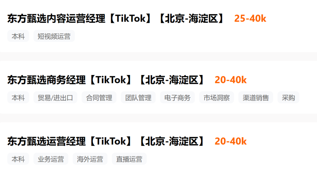随着海外市场的开拓逐渐清晰,越来越多的机构开始布局海外业务,头部MCN机构也纷纷入局。就在最近,东方甄选启动了海外业务相关职位招聘,包括内容运营经理、商务经理、运营经理和TikTok海外店铺运营等岗位,月薪介于2万元至4万元之间。