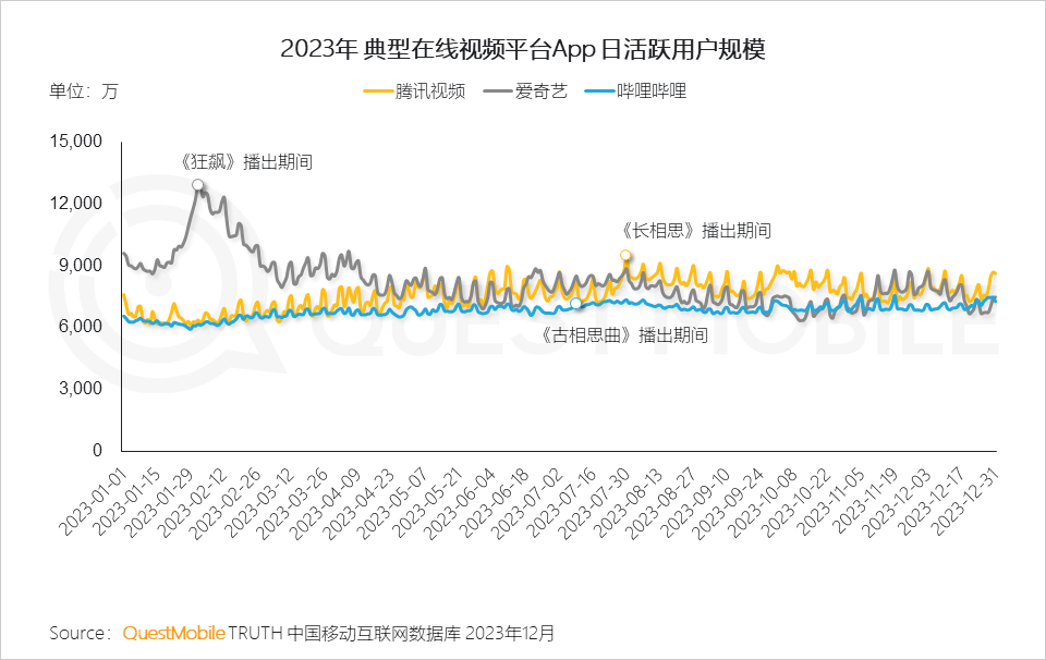 确定性方面,从上文QuestMobile爆款与日活用户规模的走势图上就能看出,《长相思》播完后,腾讯视频的日活走势整体依旧平稳,并没有出现断崖式下跌,这表明平台日常的内容供给承接住了用户流量。