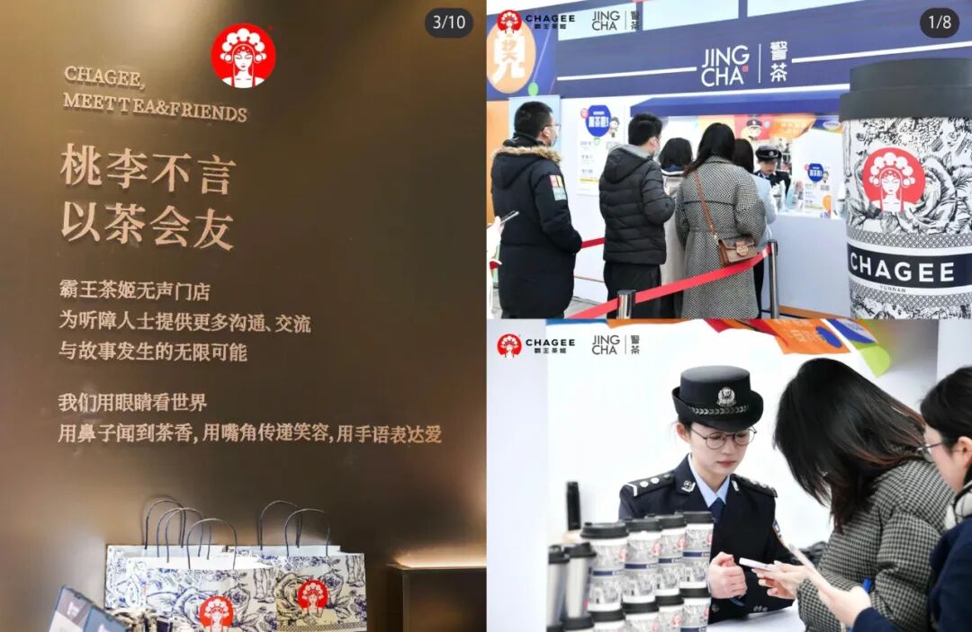而霸王茶姬也在认真践行“茶道”这件事,并积极履行社会责任,公益、救灾、捐款一个都没落下:驰援甘肃地震,支援北京、河北抗汛救灾,每次都是冲在前面,还开了对听障人群友好的无声门店,为杭州公安的“警茶”站台……