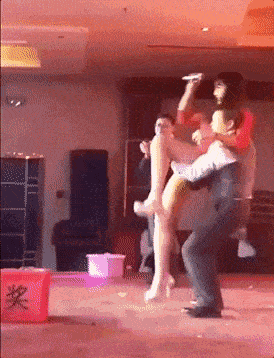 一个高管抱起表演的反串演员重重一摔,自己一脸陶醉,演员好几分钟都没能起身,底下却一片叫好。