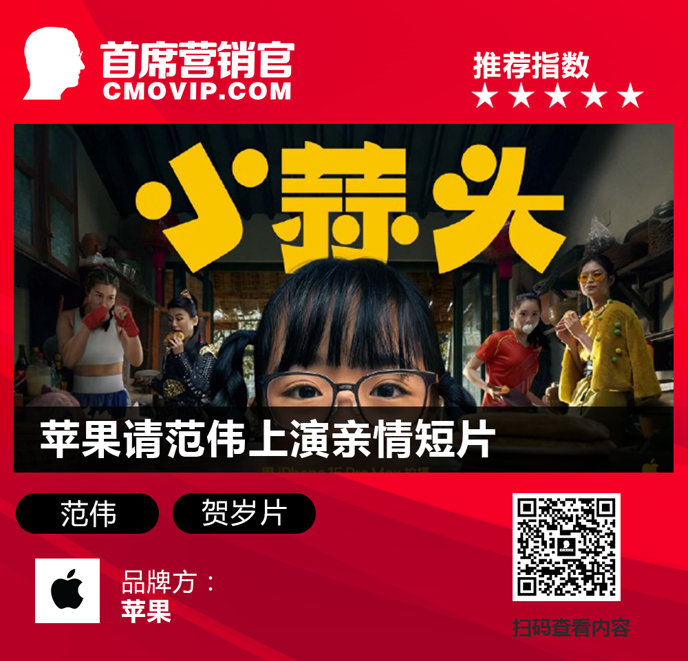 又迎来一年一度的苹果“贺岁片”,这是苹果第七部新年短片《小蒜头》。该片由《超凡蜘蛛侠》导演马克·韦布使用iPhone 15 Pro Max拍摄,演员范伟主演。短片讲述从小因为外貌自卑的女孩,在某天发现自己意外获得了可以成为任何人的超能力,继而发生的一系列成长的故事。点评:苹果的新年贺岁片不仅展现了其在本土化营销方面的创意和诚意,更是一次对苹果手机影像能力的有力宣传。
