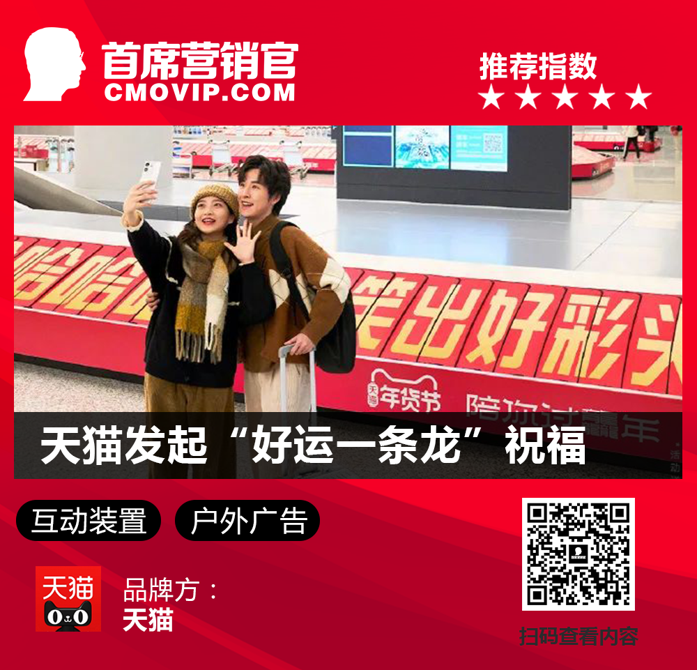 随着春节将近,天猫年货节以「好运一条龙」为主题,用抽卡、集卡的形式,为年轻人们送上了新年第一份“龙运”。其次,在杭州湖滨银泰,天猫打造了一个名为「快乐提取处」的互动装置。路人只要对着装置发出“哈哈哈哈哈”的笑声,就有机会赢得红包。同时,天猫也在杭州萧山机场的行李传送带印上了“哈哈哈哈哈”的文案。乘客们只需打开淘宝,扫描任意一个“哈”字,就有机会赢取最高888元的红包。点评:通过这些创意玩法和福利措施,天猫年货节成功地吸引了无数消费者的参与,提升了品牌知名度和美誉度。