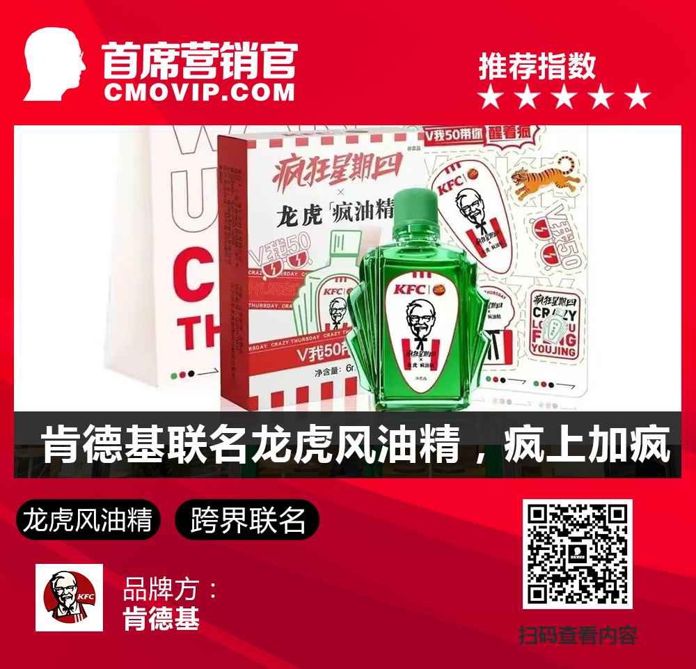 近日,肯德基与龙虎风油精开启跨界联名,推出了「龙虎疯油精」、精油贴以及包装袋等,让疯狂星期四“疯上加疯”。联名名称“疯油精”玩起了谐音梗,造型设计则是将原瓶身的风油精贴纸,换上了带有肯德基LOGO的贴纸,让人眼前一亮。点评:肯德基与龙虎风油精的联名活动是一次成功的商业合作,它将两个不同领域的品牌巧妙地结合在一起,为消费者带来全新的体验,也进一步巩固了肯德基在年轻人中的品牌形象。