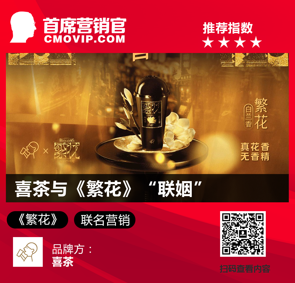 近日,喜茶联名《繁花》以“至真至喜”为口号,推出了联名饮品「花(白兰香)」。同时,喜茶以剧集经典物品及地点“黄河路的至真园饭店”为灵感,带来了联名杯贴、提卡及黄河路贴纸、至真至喜纪念票根两款周边。点评:喜茶与《繁花》的联名活动是一次成功的品牌合作,不仅提升了品牌知名度和美誉度,也为消费者带来了更多的惊喜和体验。