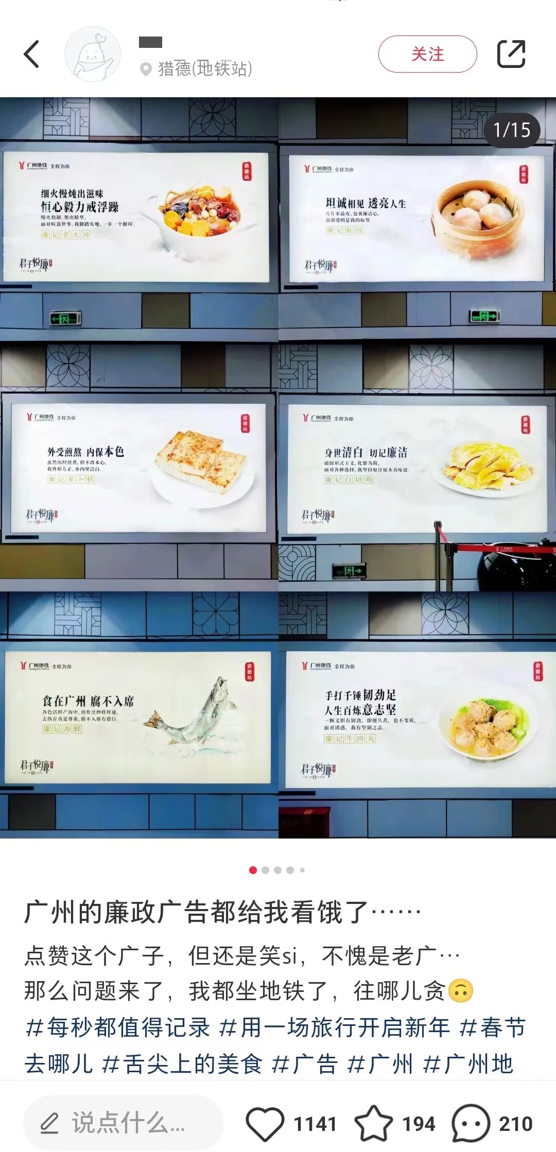 在小红书上,有网友偶遇广州猎德地铁站的廉政广告,宣传图被设计成“廉记”菜单的样子,乍一看是餐饮广告,仔细一看才发现原来是反腐倡廉广告。廉洁的格言警句借助一系类广州特色美食,让人眼前一亮。宣传图做得太诱人了,一整个把人给看饿了。