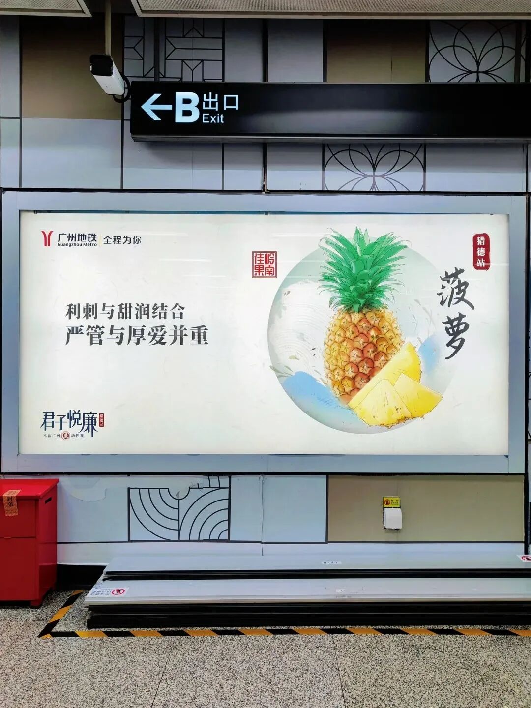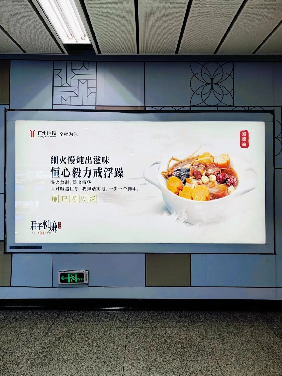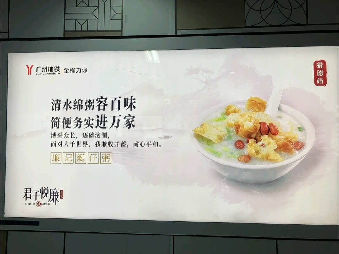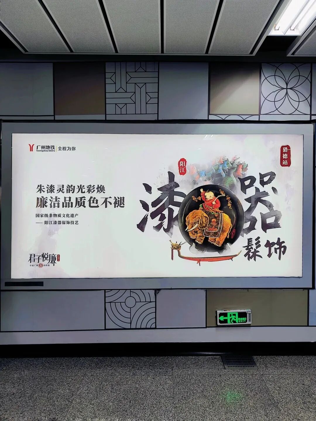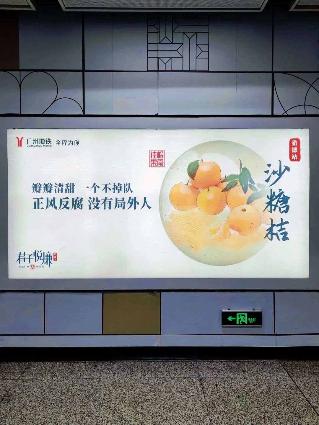 别以为只有以上这些,广州猎德站的防腐公益广告还真不少。地标特色篇选取了猎德牌坊、猎德炮台、李氏大宗祠宗祠、列水桥等本土文化符号,深度探寻古村民俗与廉洁文化的契合点,宣传廉洁文化。原本严肃正经的廉政宣传文案,通过结合结合岭南饮食文化或者城市地标,不仅趣味十足,还更加生动形象;相比传统的喊口号式宣传,这种接地气的广告更能吸引行人目光,实现有效宣传。