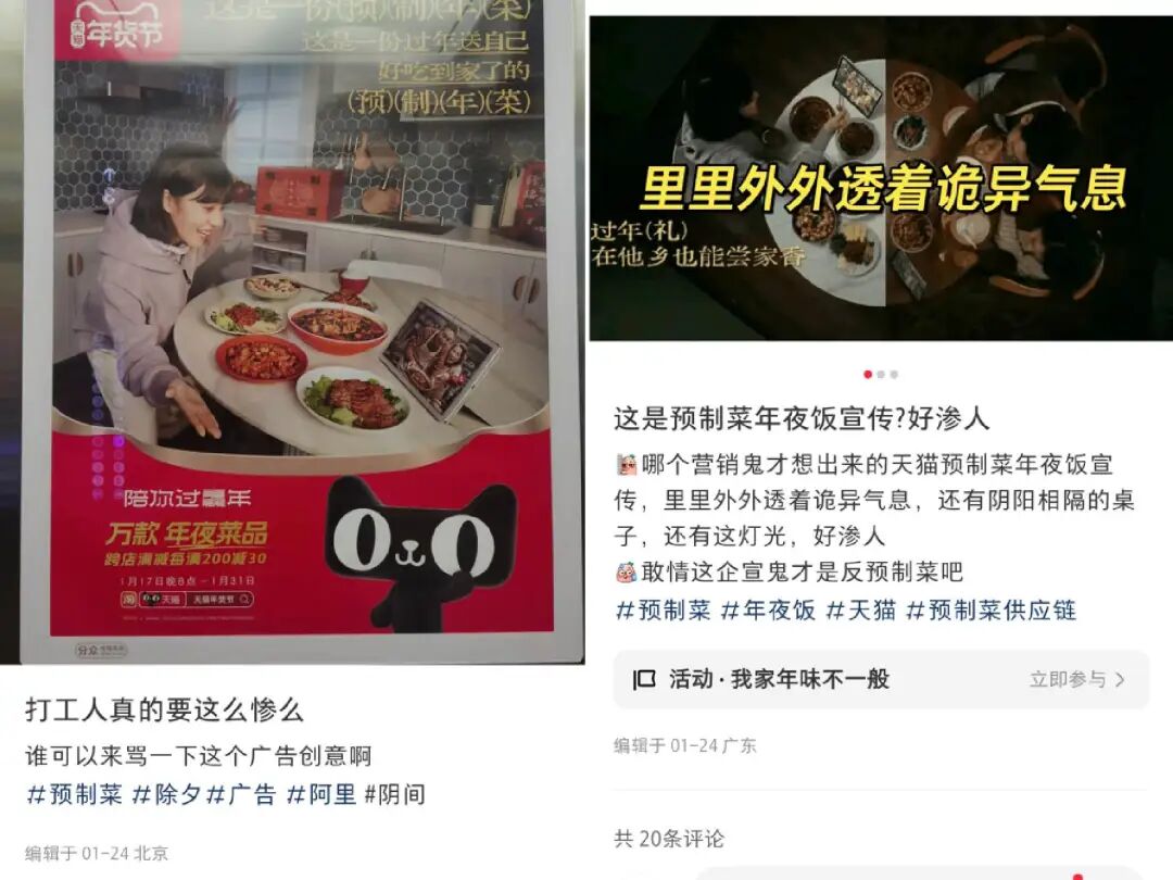 前几天,#天猫预制年夜菜广告引争议#的广告一经推出便迅速引起争论,一度令许多人情绪激烈。有网友吐槽称“我不排斥预制菜,可这广告又是一个人过年,又要吃预制菜,太社畜了,引起不适。”因为按照今年法定节假日,除夕要上班,而这波广告的核心群体又是面对上班族,广告中却击中了无数打工人的心绪,凄凉感油然而生。