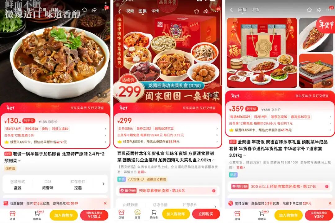 据某品牌淘宝客服称,他们的年夜饭礼盒套餐仅仅预订已经达到破万销量。在淘宝、京东等电商平台,搜索年夜饭关键词,热度加高排在前面的就是“年夜饭预制菜、年夜饭半成品”等等。