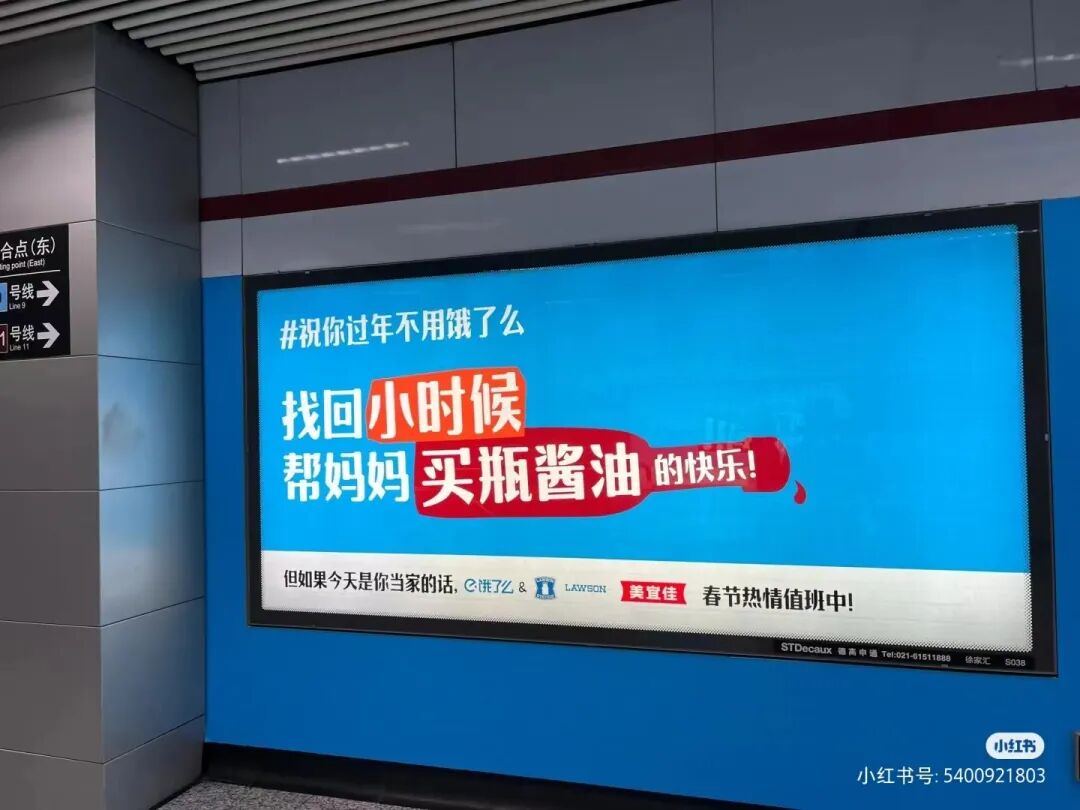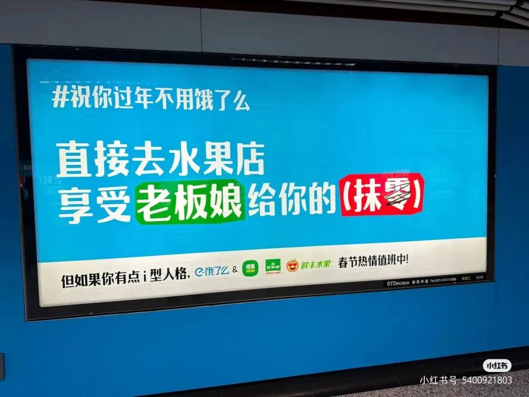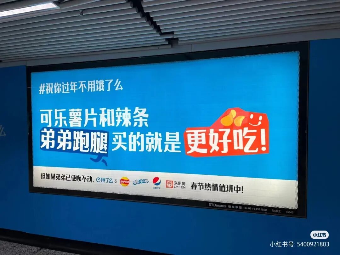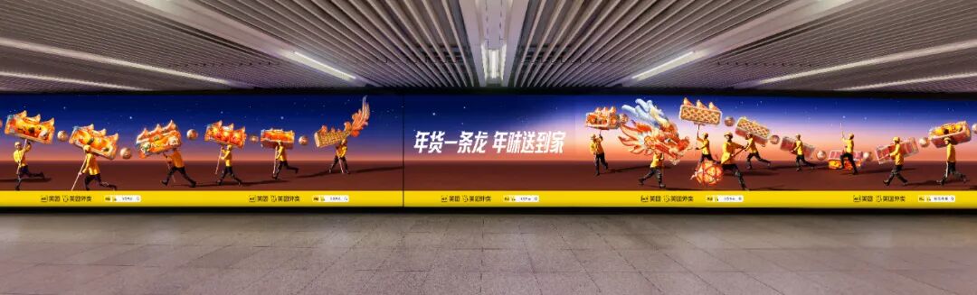 尽管理论上说,作为一个阖家团圆的节日,春节期间的商家和骑手数量都会减少,顾客点外卖的需求也会有所减少,但是这并不妨碍外卖平台期望在春节这一特殊时期与用户进行深入的对话,无论是出于建立情感联结,还是期待获得相应的品牌声量、销量增长等目的。美团外卖在北京的地铁站投放了一则超长的海报,传达平台上的年货覆盖多个品类,产品适用于不同的场景,可以有效地帮助用户解决年货问题。