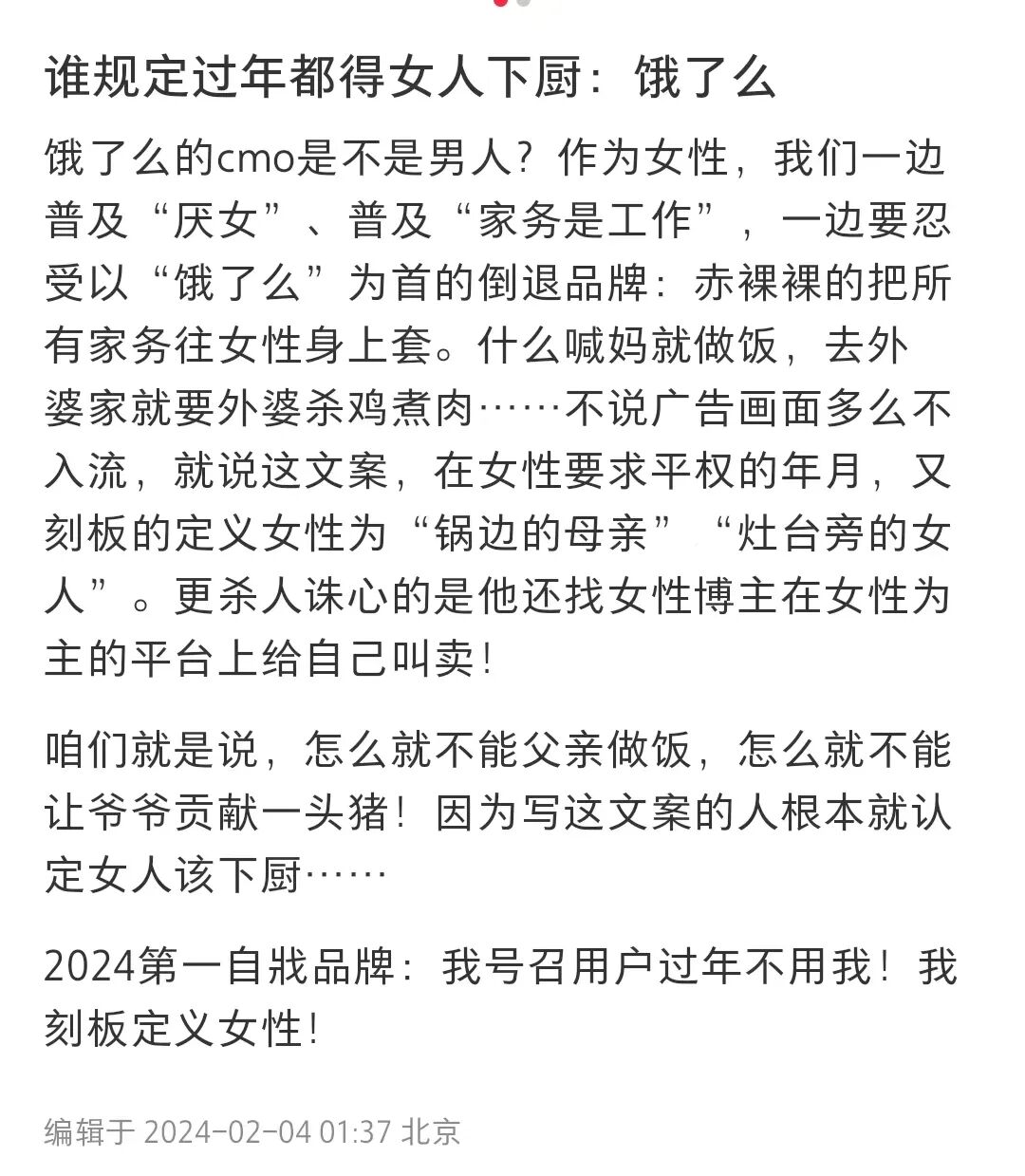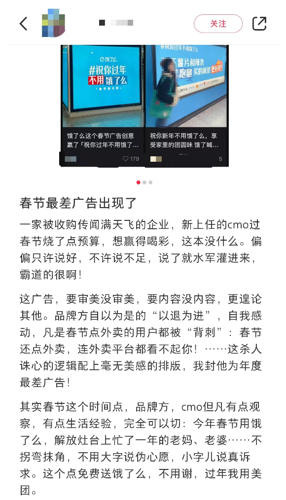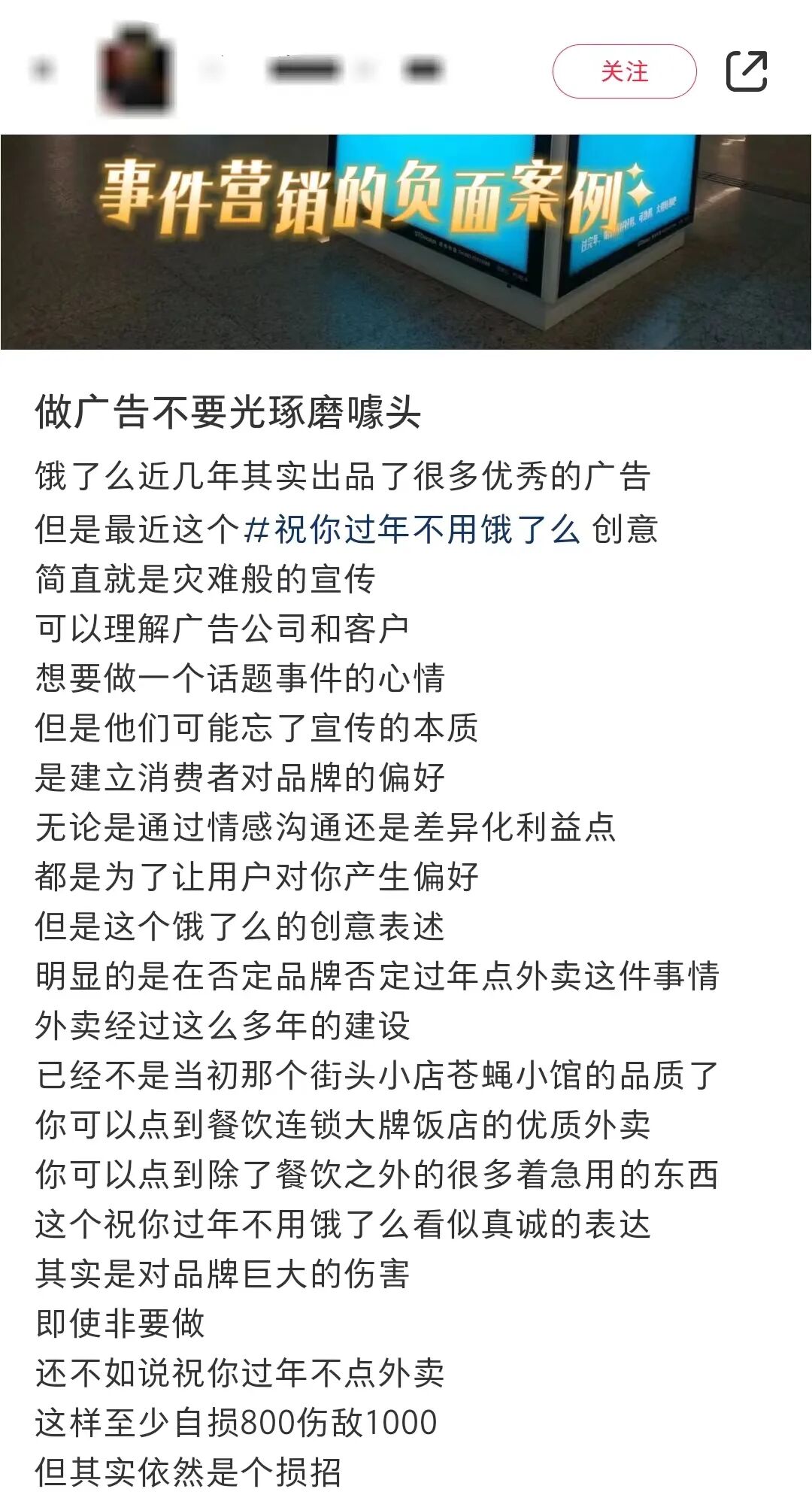 还有觉得做广告不要光琢磨噱头,祝你过年不用饿了么看似真诚的表达,其实是对品牌巨大的伤害。