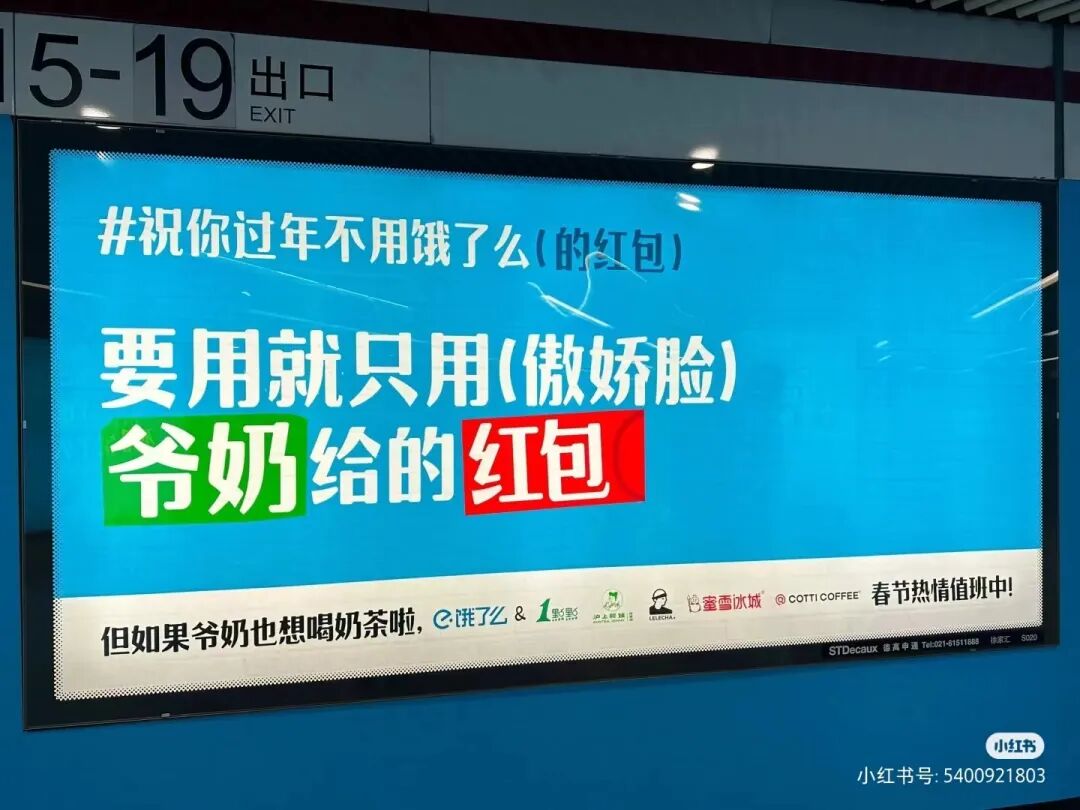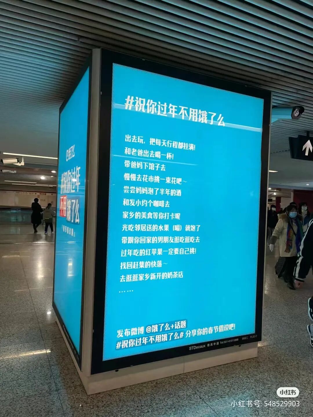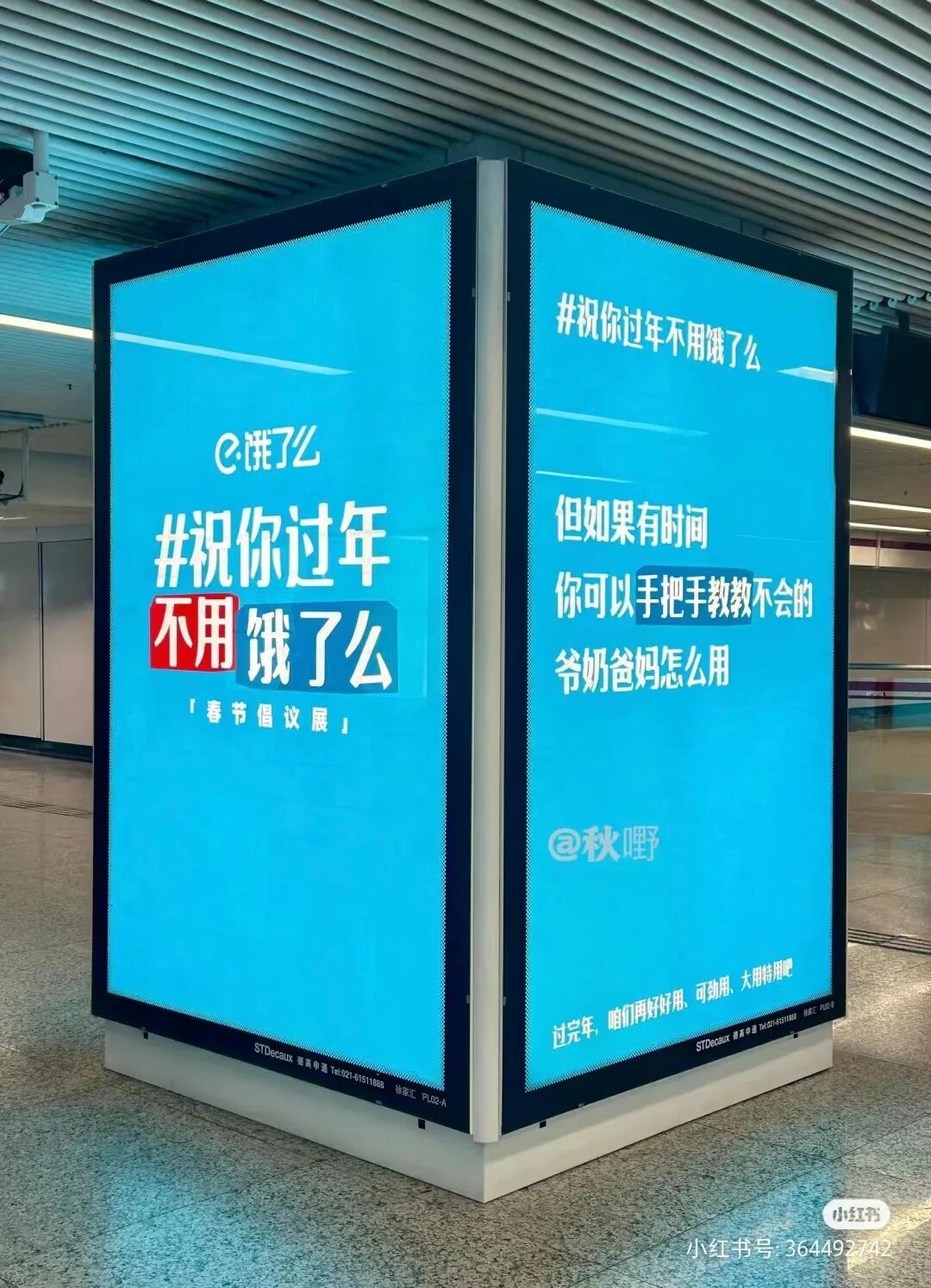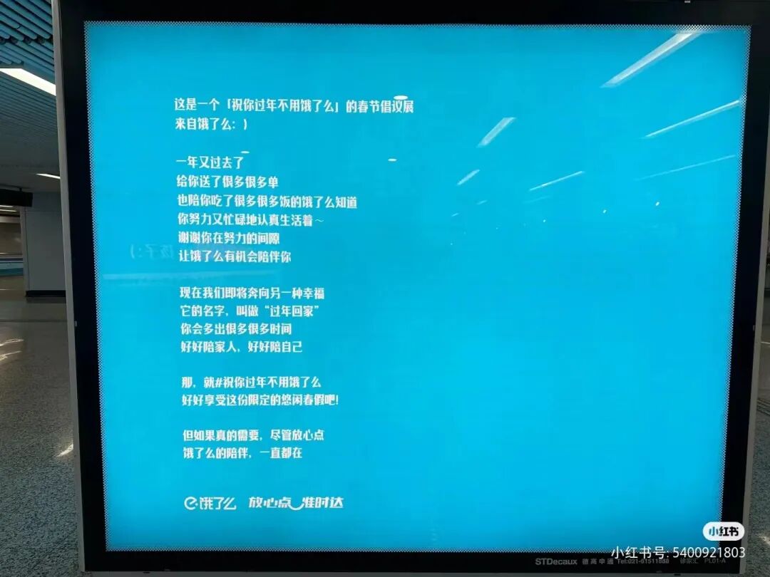 是这样的,最近不是快过年了嘛,然后饿了么就在上海的徐家汇地铁站投放了一组广告,也是一个小型的「春节倡议展」,内容就是「祝你过年不用饿了么」,而且理由给得还相当丰富。因为现在我们即将奔向另一种幸福,它的名字,叫做“过年回家”。