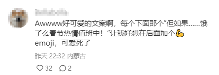 我怀疑饿了么在我家安了监控(bushi),手插大米什么的真的太有画面感了。有网友评价:好可爱的文案。每张海报下面都有一行小字,但如果……饿了么春节热情值班中,真的不仔细看还发现不了,文案果然还留了一手!看来甲方也不是那么好糊弄的。