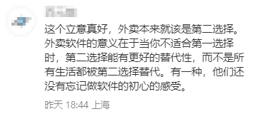 还有网友直接分析,这个立意很好,外卖本来就该是第二选择,这个广告就有种品牌还没有忘记初心的感觉。