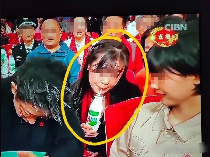 在刘谦变魔术的紧张气氛中,她始终没有停止喝手中的娃哈哈AD钙奶。