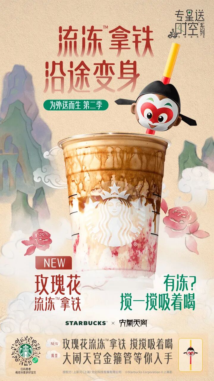 2024年星巴克与《大闹天宫》IP的联名,就是一个重要的信号。为了致敬这一经典国漫,星巴克推出了专星送新品——流冻TM拿铁。