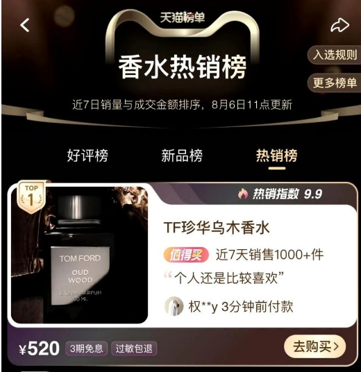 黑西装一穿,香水一喷,后续不仅品牌的销量起来了,珍华乌木香水成功入选了天猫香水热销榜第一名。