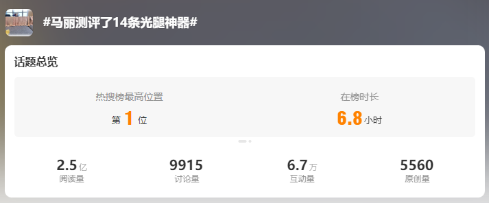 甚至距离春晚播出已经过去一个多星期了,#马丽测评了14条光腿神器#(光腿神器”指的是肉色紧身打底裤,由于颜色与肤色相近,给人一种大冷天还光着腿的错觉)的话题竟然还能以2.5亿的阅读量冲上热搜第一。