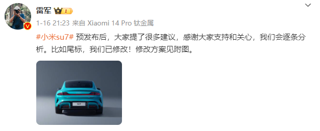 比如,雷军之前发文说小米SU7已按照大家的建议修改尾标,就狂拉了一波消费者的好感度。