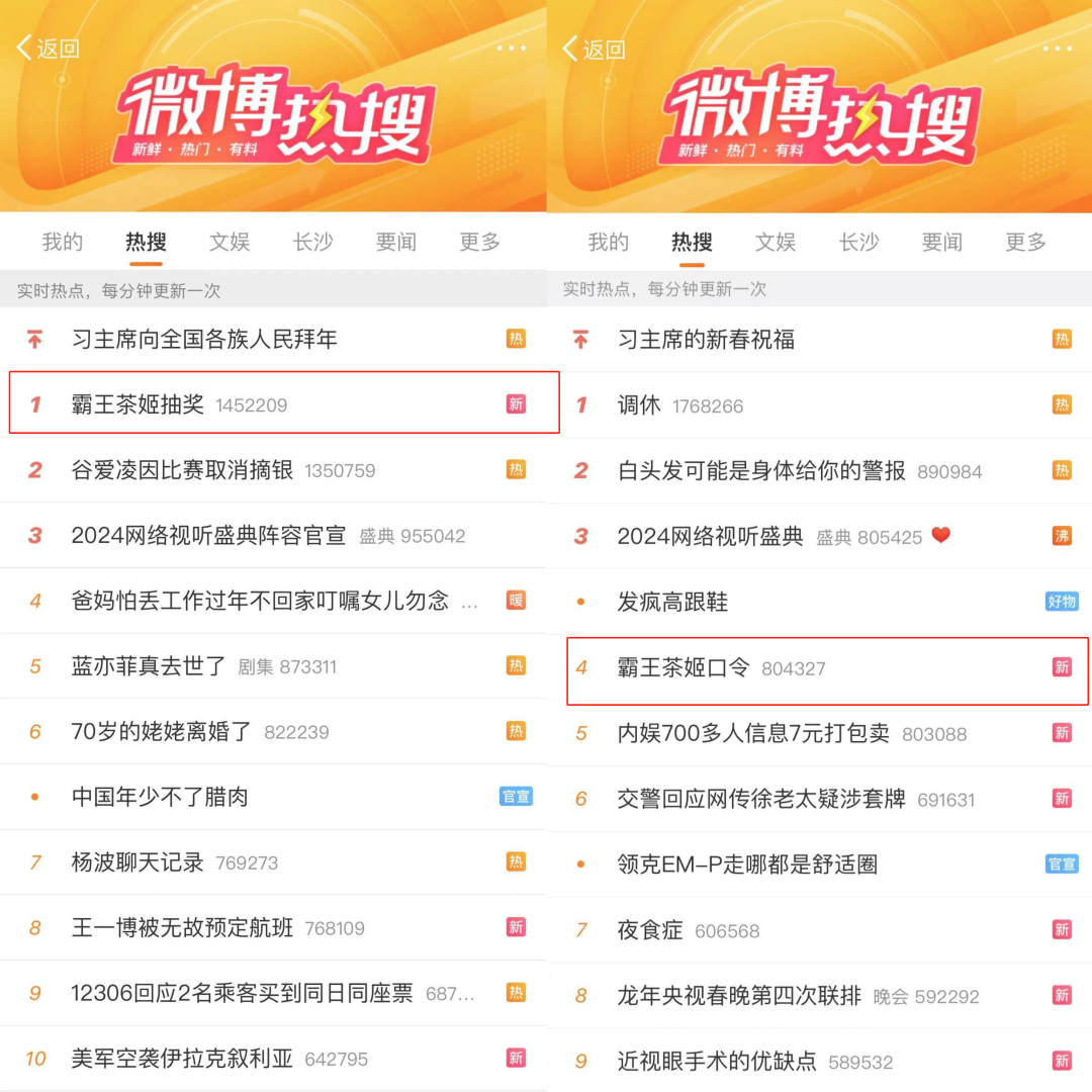 围绕互动在微博发起的#霸王茶姬口令# #霸王茶姬抽奖# #霸王茶姬杯子寓意#等话题,春节期间频繁登上微博热搜,引发广泛关注,#霸王茶姬抽奖# 更是冲至榜首。