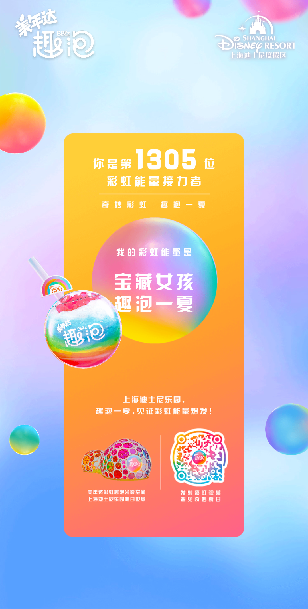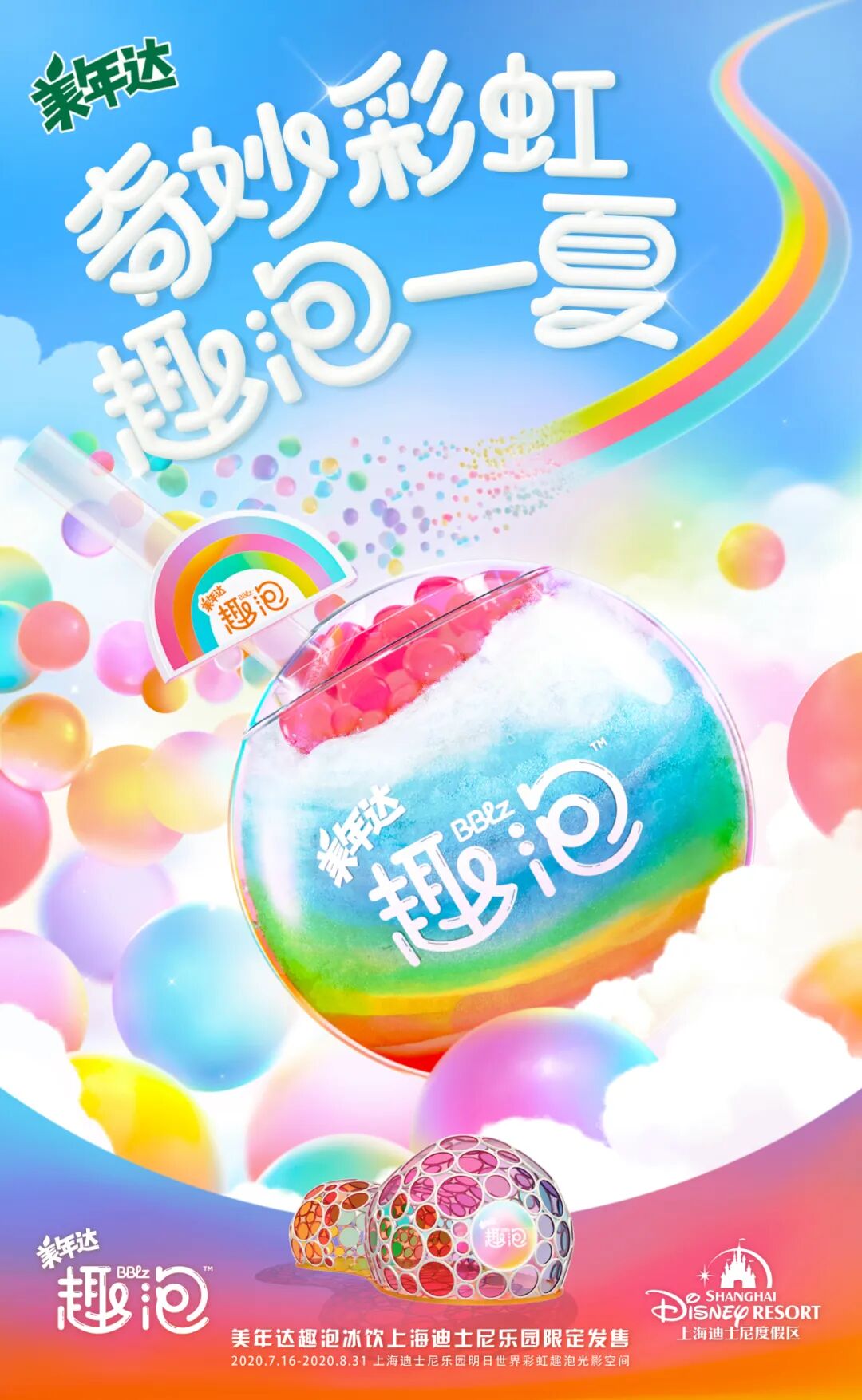 美年达深刻洞察年轻人情绪和心境的变化,将彩虹美好寓意与美年达的“有趣”、上海迪士尼乐园的“奇妙”串联起来,推导出“趣泡”的创意——“有趣的人泡在一起”。