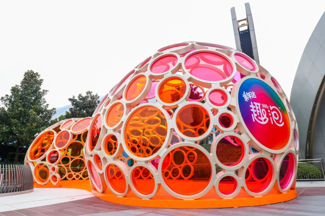 在现场可以看到,彩色玻璃的元素,加上现代镂空设计,让“美年达彩虹趣泡光影空间”生动呈现“彩虹”的概念。当阳光照射在泡泡装置上时,折射出五光十色的彩虹颜色,远远看上去就像一座艺术装置,让人犹如走进童话世界。