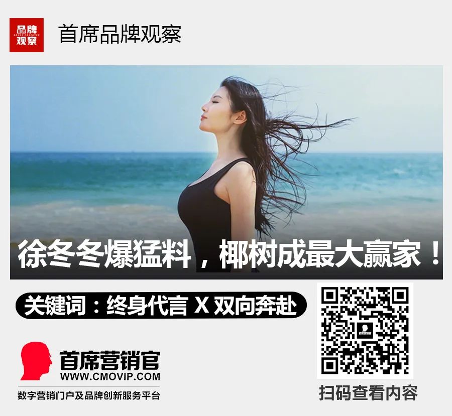 近日,椰树代言人徐冬冬官宣了即将步入婚姻殿堂,同时还给椰树打了一波强有力的广告——把椰树椰汁用作自己婚礼的专用饮料。点评:徐冬冬与椰树之间这份情谊称得上超越了99%的品牌与代言人之间的合作,他们的关系并非仅限于商业层面,还延伸到生活的各个方面。从互动中,我明明可以感受到他们是一路携手走过来的,见证了彼此的共同成长,这大概就是广告代言的最佳范本吧。