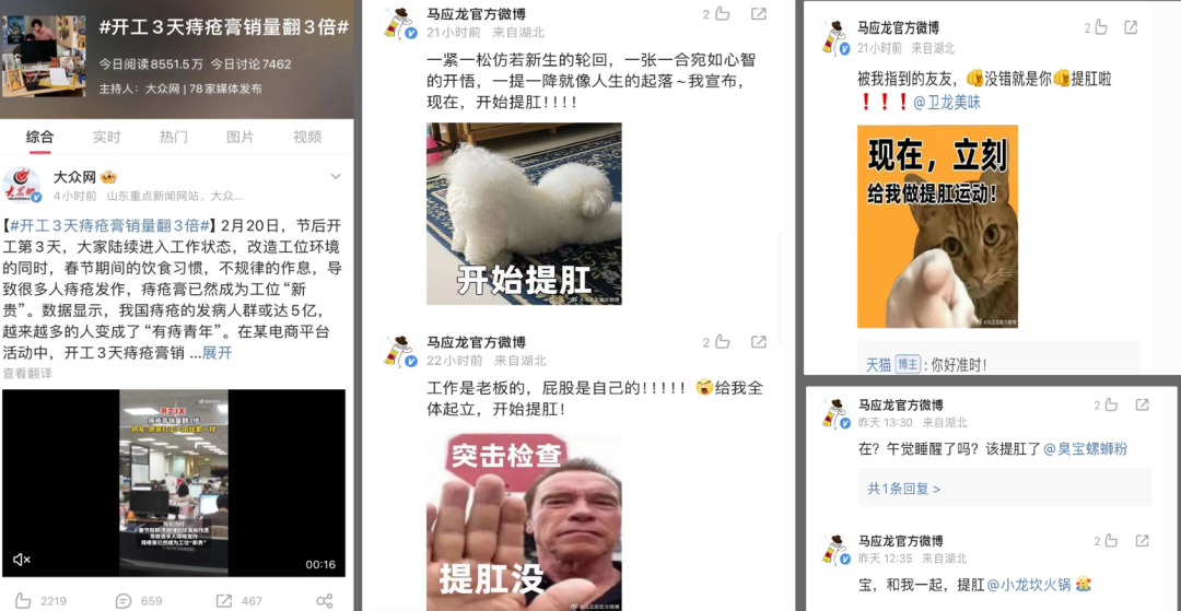 正是在#开工3天痔疮膏销量翻三倍#的话题冲上热搜的节点,马应龙及时下场,和天猫一起贴心地在微博开展“提肛突击检查”,被评论区网友冠以“提肛侠”称号不说,还吸引了卫龙辣条、小龙坎火锅等麻辣食品品牌加入“提醒打工人提肛”的行列,并顺势推出这款「指定能行工位」,关爱屁股,马应龙你是认真的。