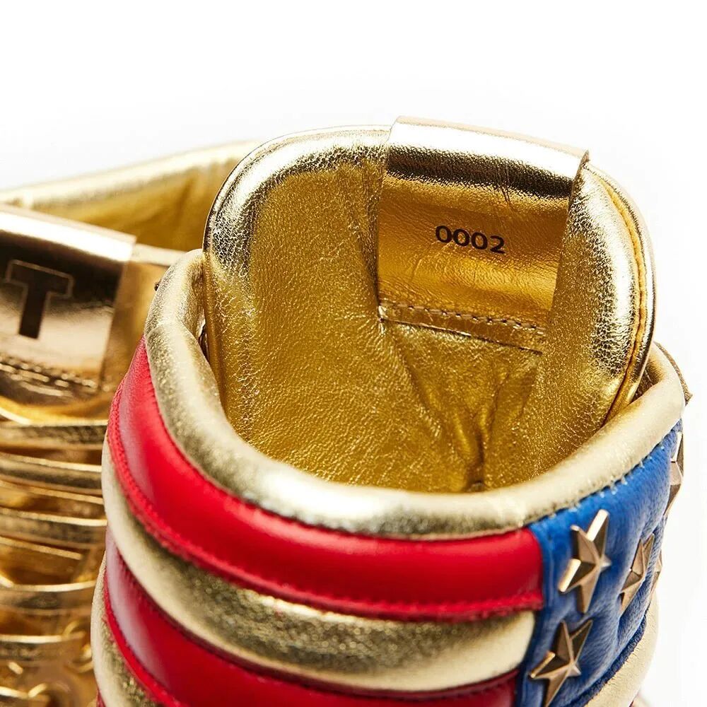 鞋面采用金色覆盖,鞋底是复古大红,后跟环绕美国星条旗元素,鞋侧与鞋舌位置醒目 T 字点缀,凸显川普的身份。