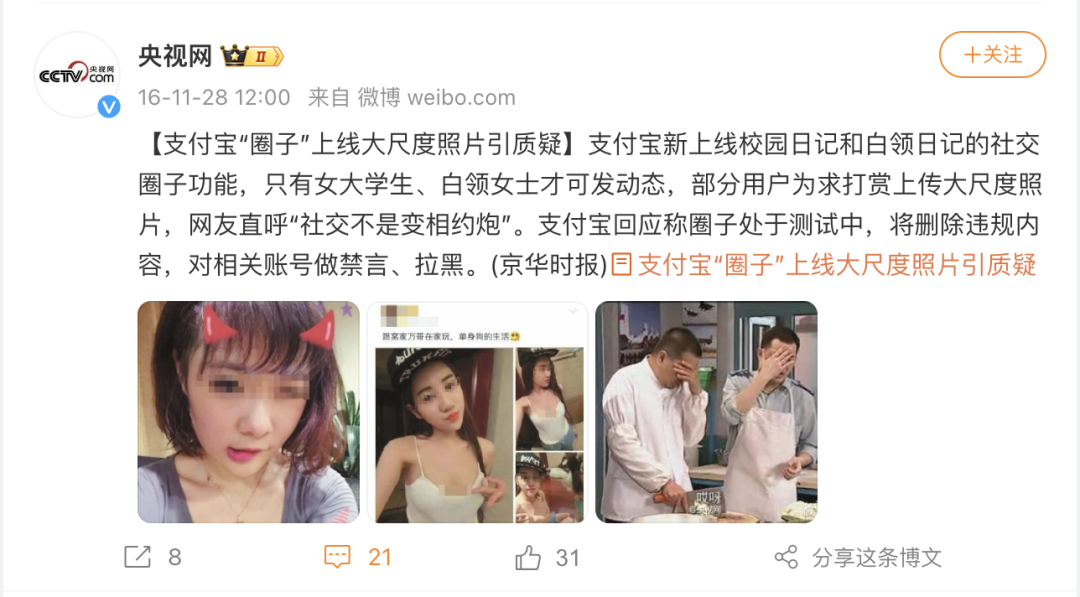 可惜在2013年,阿里就收购了当时的王牌社交应用——微博,而微信公众号也成功开辟了以“内容+社交”为核心的自媒体生态,支付宝在社交领域的尝试不过浅尝辄止,更悲催的是“圈子社交”因为内容失控捅出大篓子,无奈只能下线关停。