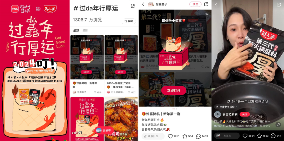 而这些年味新习俗在小红书《超好吃囤年货》IP中彰显得淋漓尽致。其中不乏各领域达人分享用好人家准备年夜饭、分享年货攻略等,为「过年主理人」送上充满地域特色的乡情,炒热年味氛围。与年味情绪挂钩的种草内容,精准戳中大众情绪,汇聚成新一代主理人所期待的年味方式。好人家定制话题#过da年行厚运 浏览量超1300万,帮助品牌成功破圈。