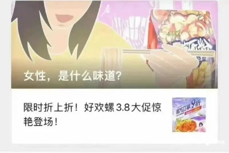 比如,在去年国际劳动妇女节,好欢螺推出了一篇名为《女性,是什么味道?》的文章。本来是想趁节日营销,亲近消费者,可是自家卖的是以女性用户为主导的螺蛳粉,将这个重口味产品与女性味道关联在一起,不是纯纯的膈应人吗。不出意外,好欢螺因文案翻了大车,品牌也紧急删除了文章。
