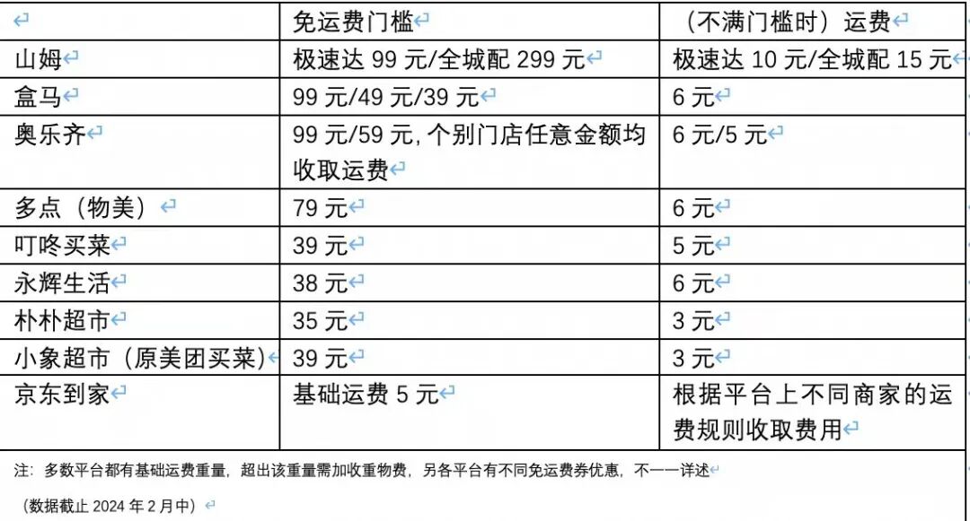 目前包括山姆极速达、奥乐齐、朴朴等零售企业也在过调整免运费门槛的市场化手段优化运力资源。