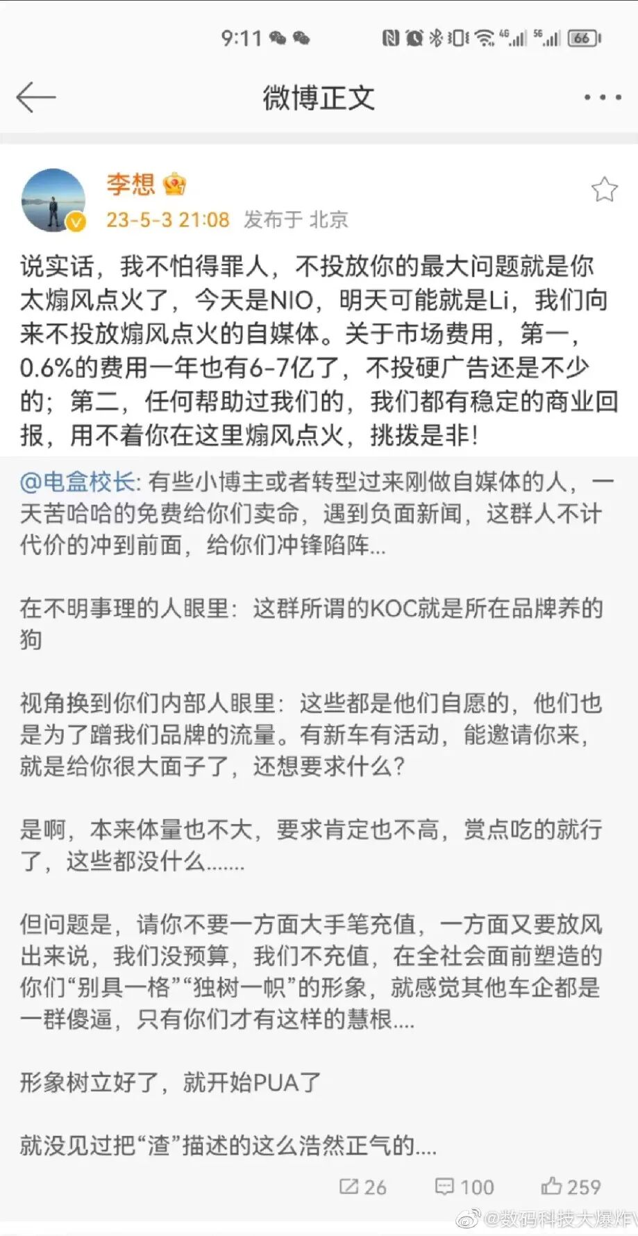 对此,李想直接转发了这位博主的微博,同时评论称:说实话,我不怕得罪人,不投放你的最大问题就是你太煽风点火了,今天是NIO,明天可能就是Li,我们向来不投放煽风点火的自媒体。