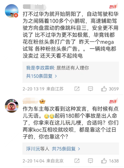 “打不过华为就开始阴阳了,自动驾驶和华为之间隔着100多个小鹏呢,高速辅助驾驶方向盘震动的像跳科目三,安全更不用说了 比不过华为更不如极氪,毕竟钱都花在粉丝头条打广告了 昨天一个mega试驾 各种粉丝头条广告。。一辆纯电都没卖过 还天天看不起纯电”