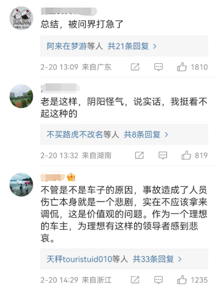 “不管是不是车子的原因,事故造成了人员伤亡本身就是一个悲剧,实在不应该拿来调侃,这是价值观的问题。作为一个理想的车主,为理想有这样的领导者感到悲哀。”