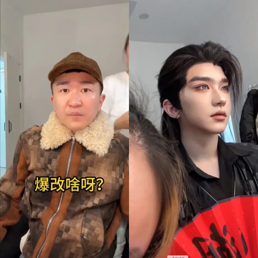 可以看到,这位博主的化妆流程通常是先戴头套、粘胶带,让面部线条更立体;接着是白色底妆,均匀肤色;紧接着是黑色修容,突出五官,使其更加精致。初看这些“爆改”视频效果的确十分惊艳,但相似的化妆手法与妆容呈现效果却令人有些审美疲劳,好像进入了网红妆容“流水线”。当然,也有例外,比如五官优秀的朱梓骁“爆改”之后某种程度上可以说是还原了帅气值。