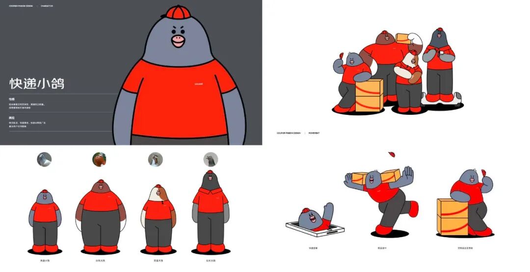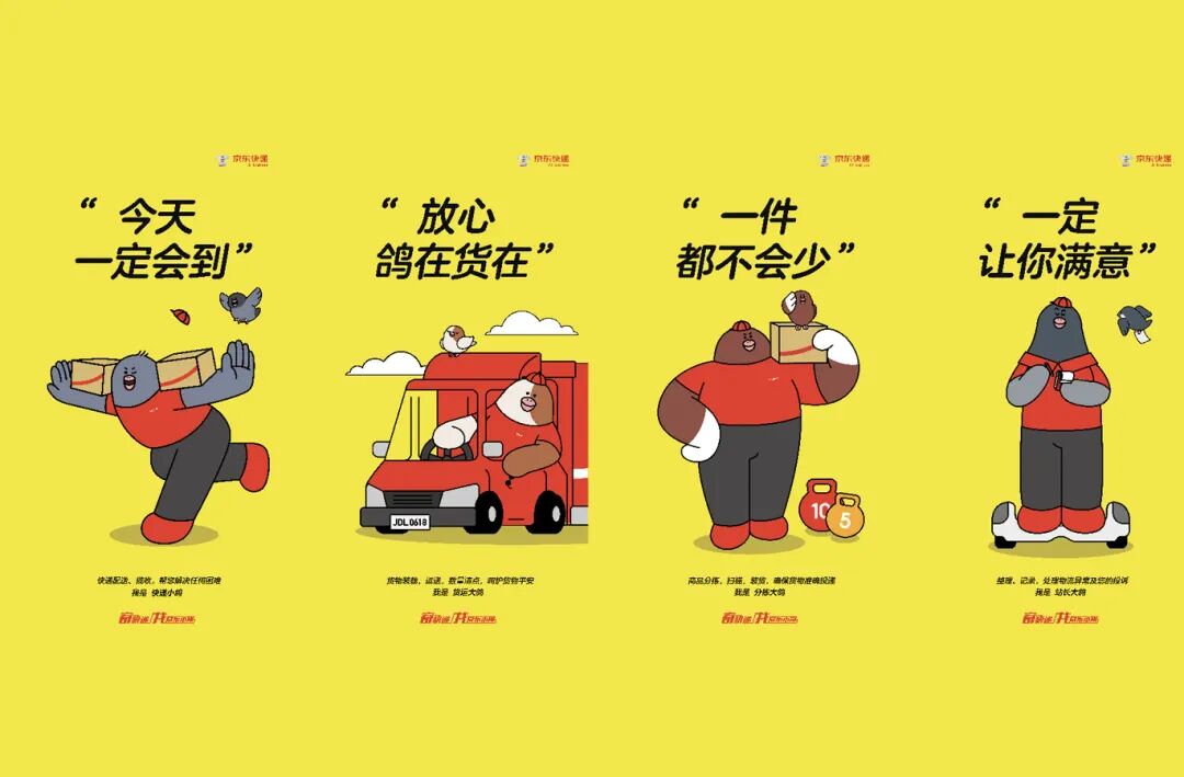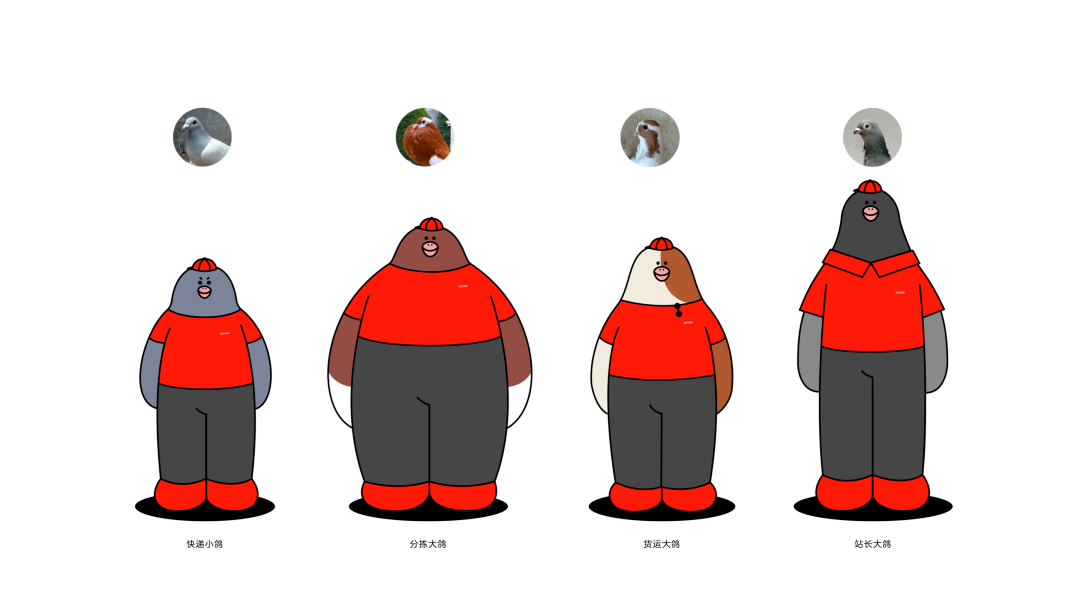 京东物流IP形象,融入了一个京东形象。一共四只,分别是快递小鸽、分拣大鸽、站长大鸽、货运大鸽。给用户提供一个具有差异化的体验。