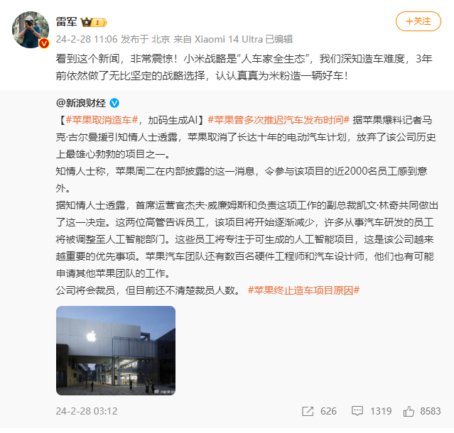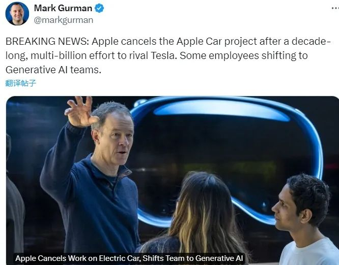 据财联社报道,2月28日,全球知名科技记者马克·古尔曼扔出了一条重磅猛料:苹果公司已经决定取消搞了十多年的电动车项目!