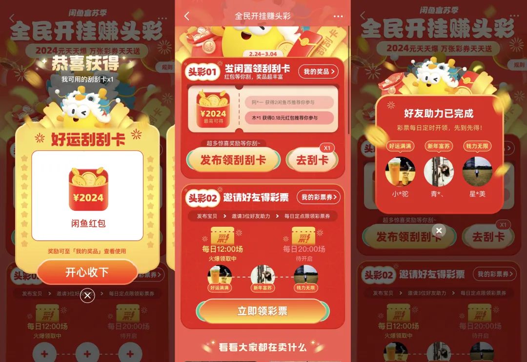 2/24 - 3/4,用户发布闲置宝贝,即有机会免费得刮刮卡和彩票兑换券。卖掉占地方还吃灰的闲置,不仅能够「赚钱回血」,还能得彩票「赚头彩」,简直是直击年轻人心坎里了。