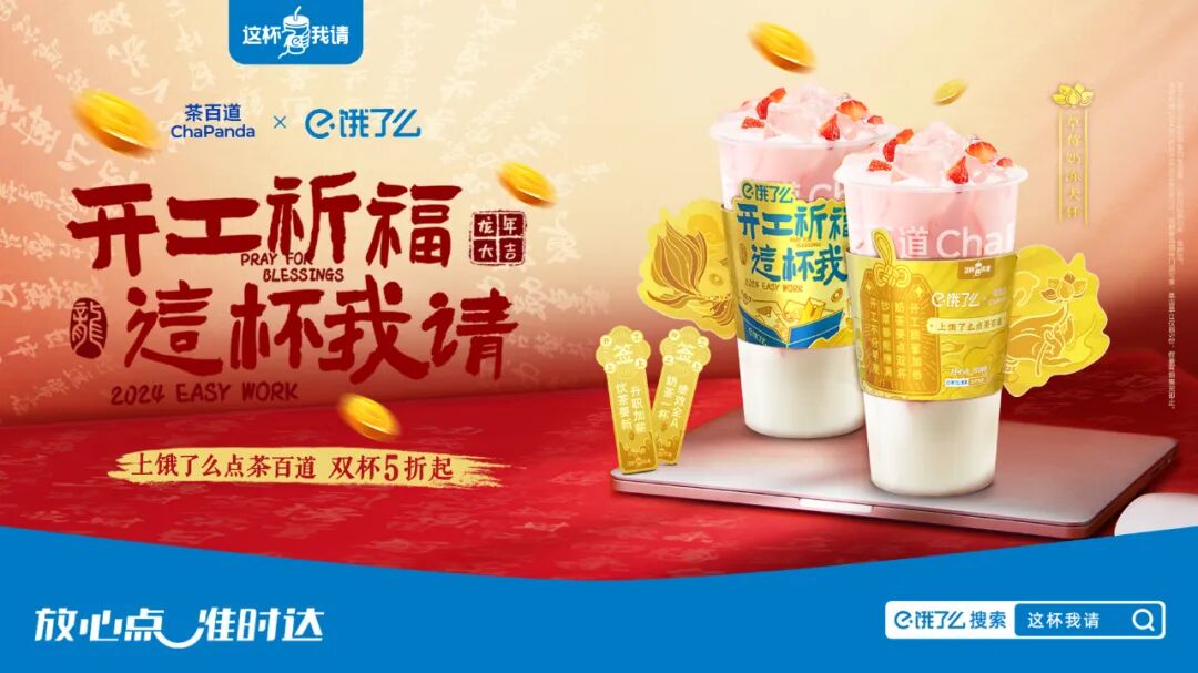 原来最近饿了么借助青岛文旅的背书,联动茶百道、奈雪的茶等奶茶品牌,打造“开工祈福 这杯我请”营销活动,推出青岛开工爆品“福签奶茶”,由“金光闪闪的奶茶杯套+好运福签+青岛文旅的开工祝词”组合,品牌通过奶茶拜佛求签的互动,打造一次人货场的营销闭环。可以说饿了么探索一次将文旅和娱乐、品牌三方深度跨界融合。出圈的背后都不是偶然,背后饿了么做对了什么?