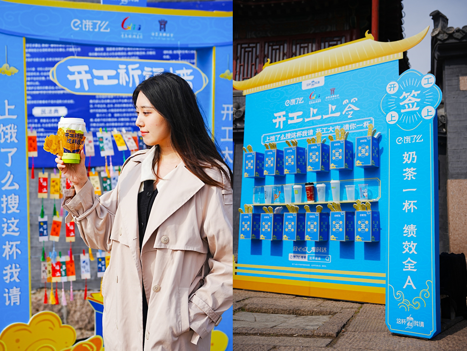 这不仅彰显了饿了么的用心之所在,也体现品牌用一种极其具象化可视化的方式,搭建了品牌与大众之间的开工互动触点,将品牌所倡导的“开工祈福,这杯我请”做了一次实在的传达。