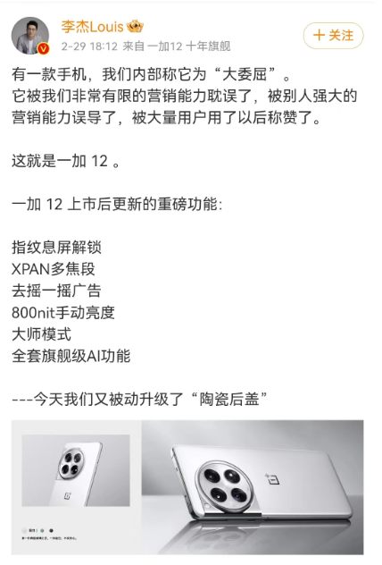 最后李杰还表示,我们又被动升级了“陶瓷后盖”,据了解,一加12的背板材质为新一代陶瓷玻璃工艺。