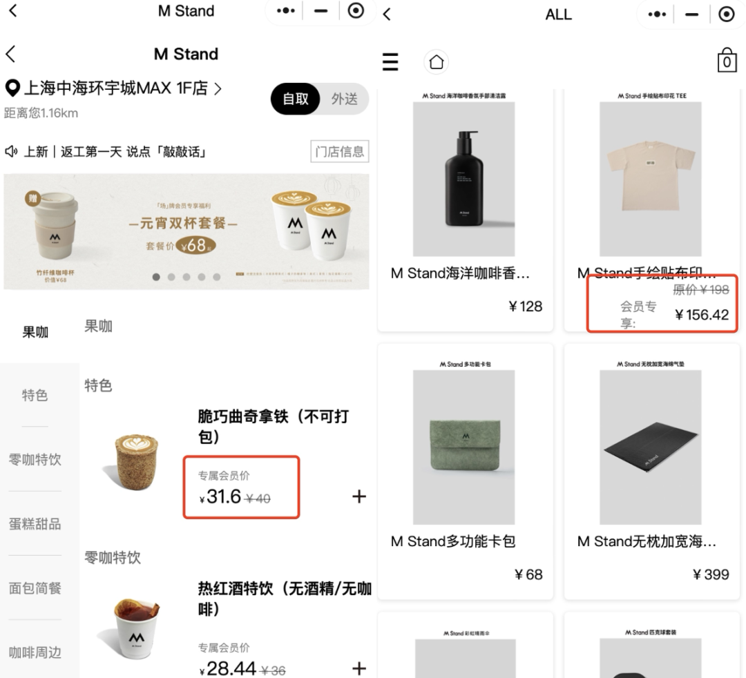 原本对 M Stand 的会员也没太在意,直到有一天下单的时候发现便宜了几块钱,一看是会员折扣,而且会员等级越高折扣力度越大(以消费金额总数定级),没有限制使用次数,这么实在的会员权益很难不让人记住。而且,其周边、套餐的一些活动也和会员制度关联,比如部分商品标出“会员专享”、“专属会员价”。