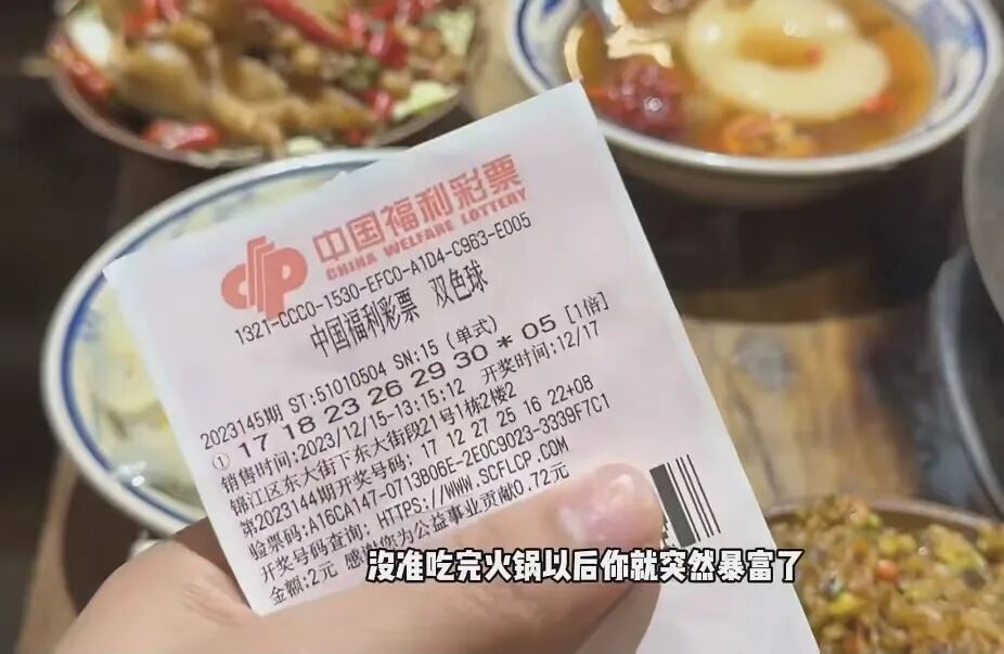 前不久,在成都冯校长老火锅,吃火锅便送福利彩票,店员还会说一句“冯校长老火锅祝您暴富”,顾客还打趣回应,“中了不用跟你们分吧?”