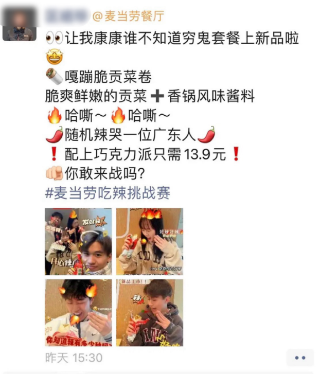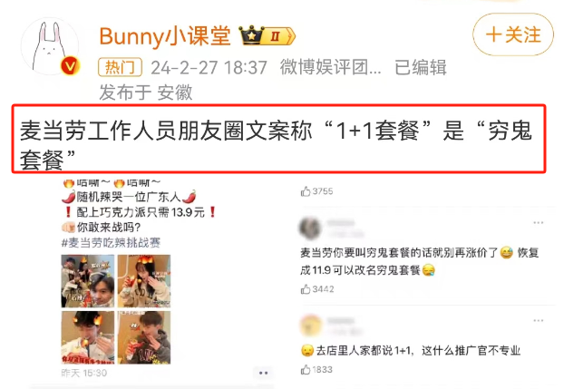 然而麦当劳工作人员发朋友圈推广,文案翻车了,被指内涵“1+1套餐”是“穷鬼套餐”:“让我康康谁不知道穷鬼套餐上新品啦!”