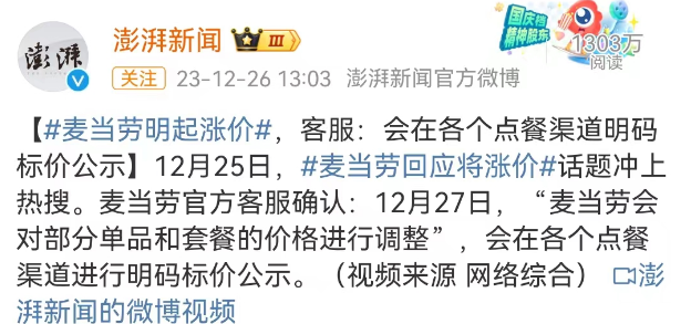 去年年底,麦当劳更是官宣对部分单品、套餐价格调整,全线提价0.5元,会员套餐同步涨价1元。