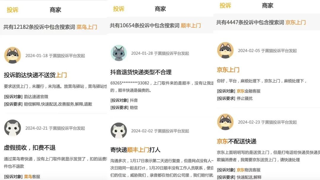 在黑猫投诉中搜索菜鸟上门,有12182条投诉;搜索顺丰上门,有10654条投诉;搜索京东上门,有4447条投诉。