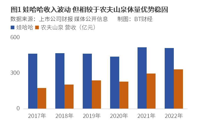 2023中国民营企业500强榜单显示,2022年娃哈哈集团营收为512.02亿元,排名降至第227位,而农夫山泉营收为332.39亿元,排名上升至第374位。