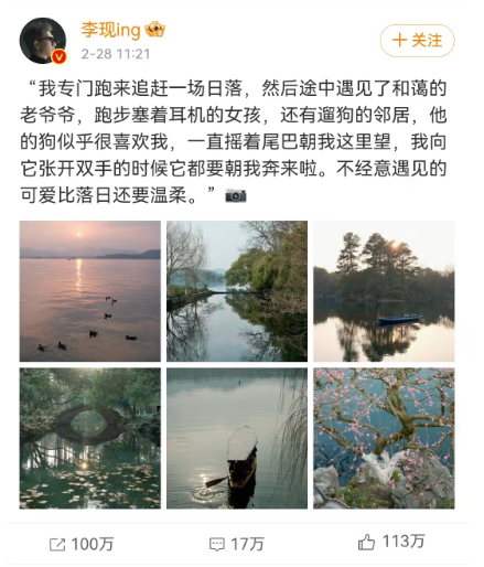缘起李现于昨日上午发布了一条文艺的微博内容,配图是清新的自然风景照。